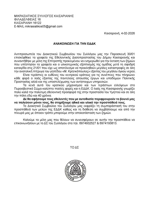 ΝΕΟ ΔΣ & ΕΕΜετά τις εκλογές της 12ης Δεκεμβρίου 2025 αναδείχθηκε και συγκροτήθηκε σε σώμα το νέο Διοικητικό Συμβούλιο του Μικρασιατικού Συλλόγου Καισαριανής, η σύνθεση του οποίου είναι: