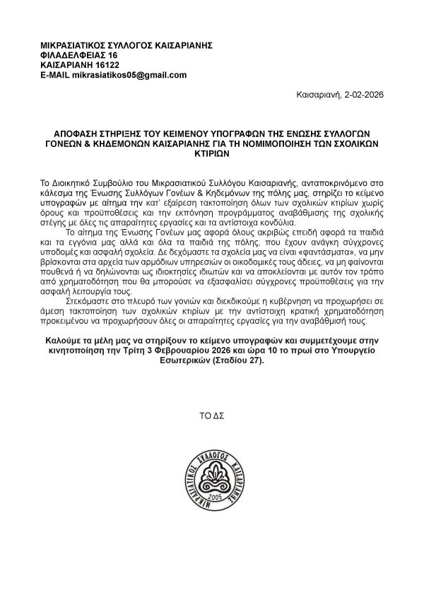 ΝΕΟ ΔΣ & ΕΕΜετά τις εκλογές της 12ης Δεκεμβρίου 2025 αναδείχθηκε και συγκροτήθηκε σε σώμα το νέο Διοικητικό Συμβούλιο του Μικρασιατικού Συλλόγου Καισαριανής, η σύνθεση του οποίου είναι: